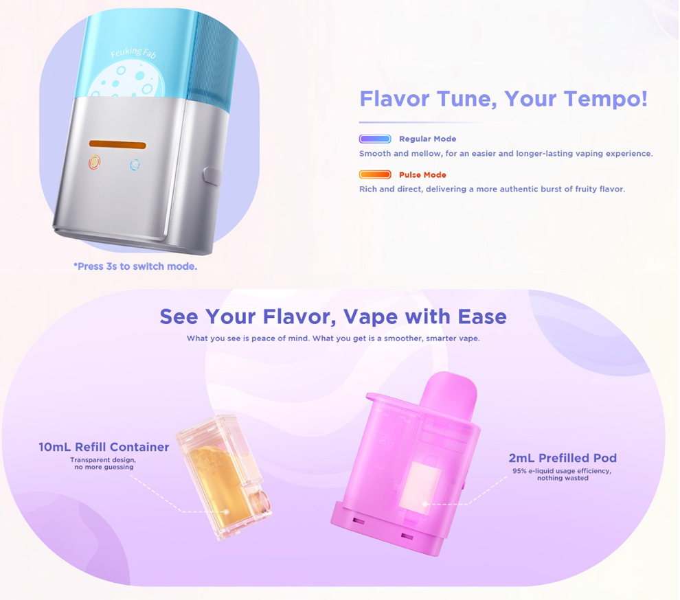 - Dual Modes: Regular (10,000 Puffs) / Pulse (6500 Puffs)